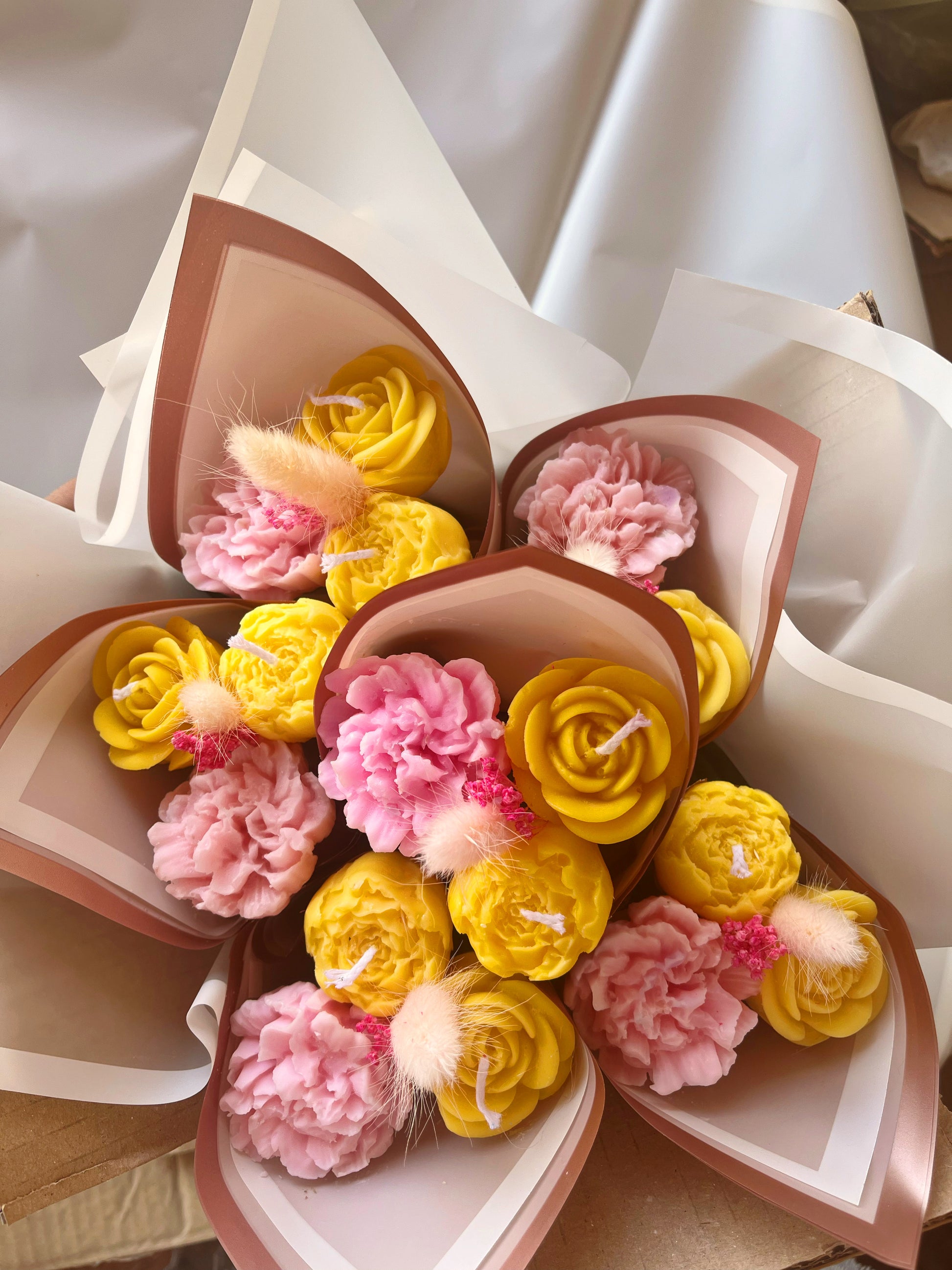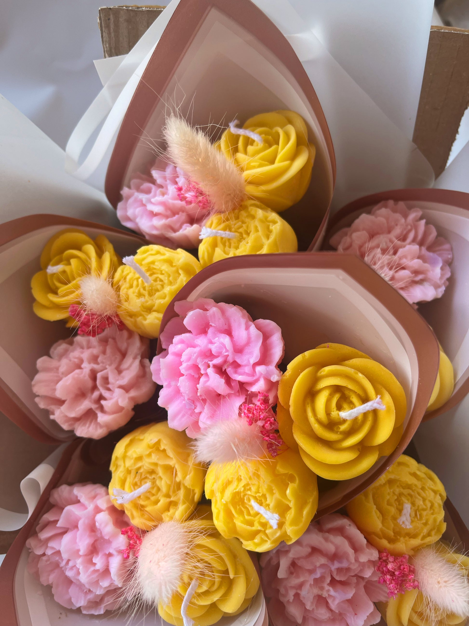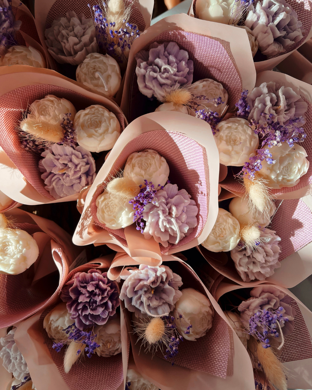 ATTENZIONE: LE CANDELE DEI BOUQUET POSSONO NON PRESENTARE STOPPINO IN QUANTO LA LORO FUNZIONE È SOLO DECORATIVA.