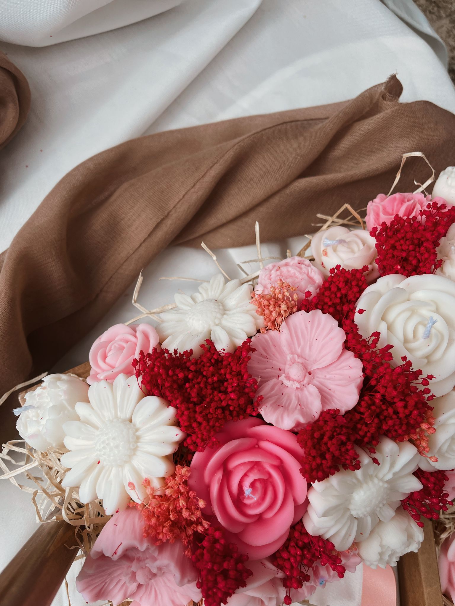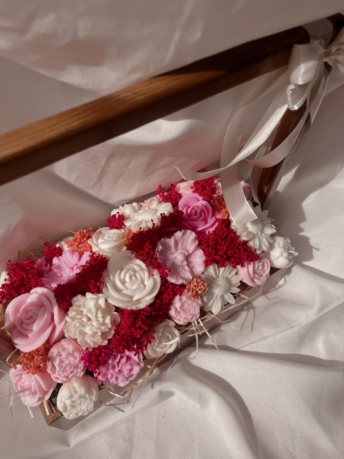 Al suo interno, una selezione di splendidi fiori di cera, ognuno modellato con precisione e passione. I fiori, delicati e raffinati, sembrano vivi e pronti a sbocciare, ma rimarranno intatti nel tempo, testimoniando l’amore e l’emozione che ogni dettaglio esprime.