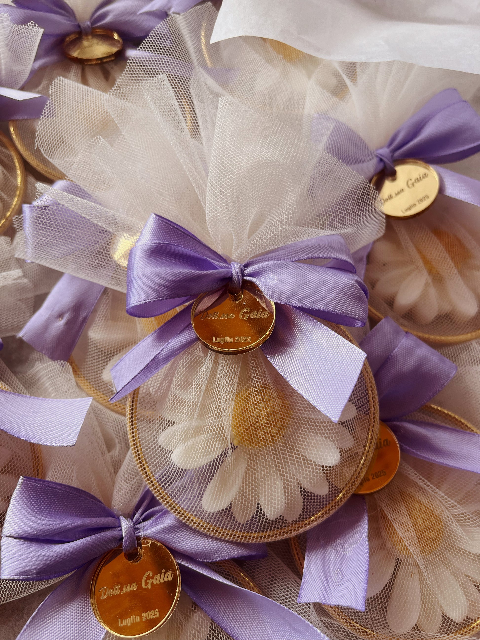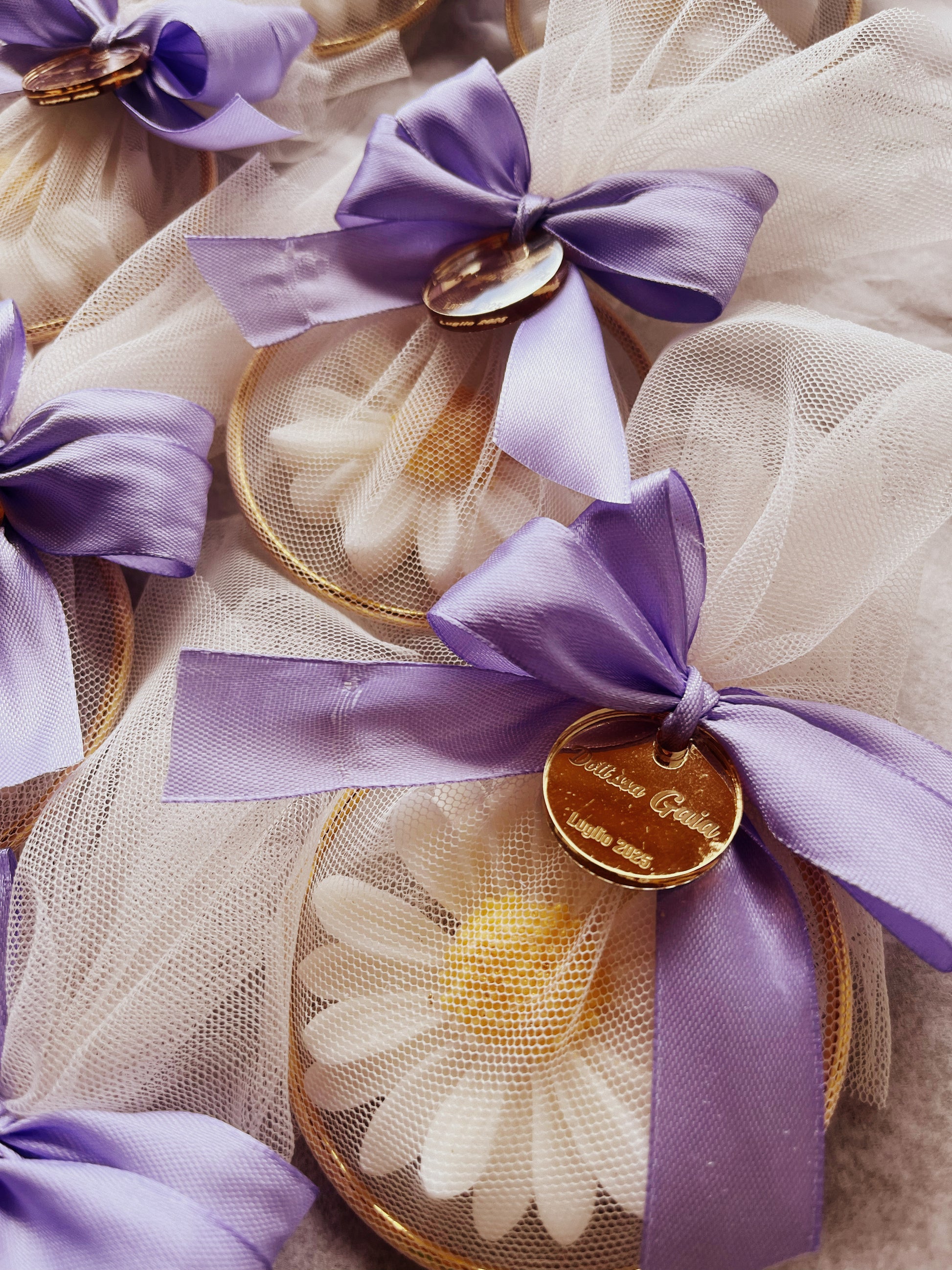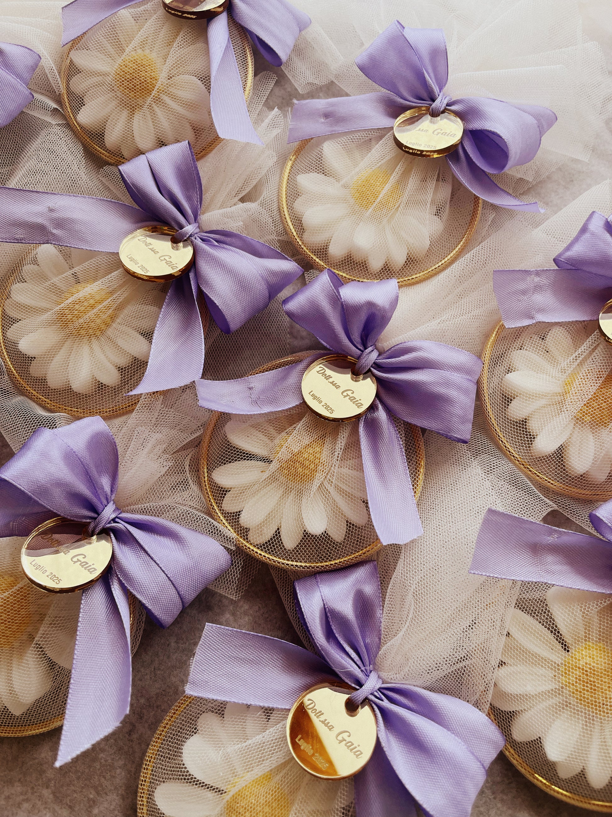 Un dettaglio raffinato per ogni occasione: la nostra candela profumata artigianale, confezionata in un elegante cerchio oro, è impreziosita da un fiocco decorativo, e una etichetta incisa personalizzata con nome e data.