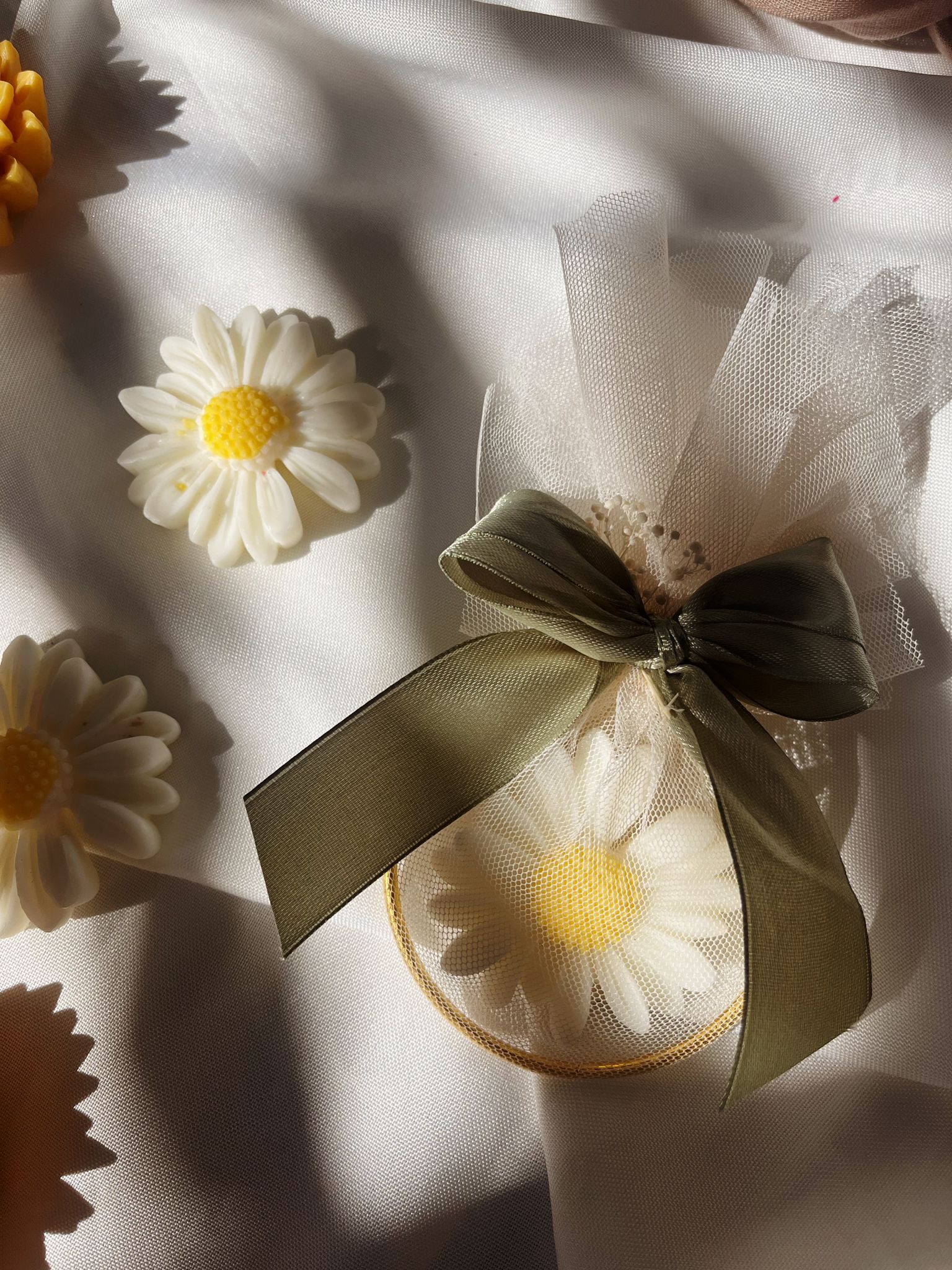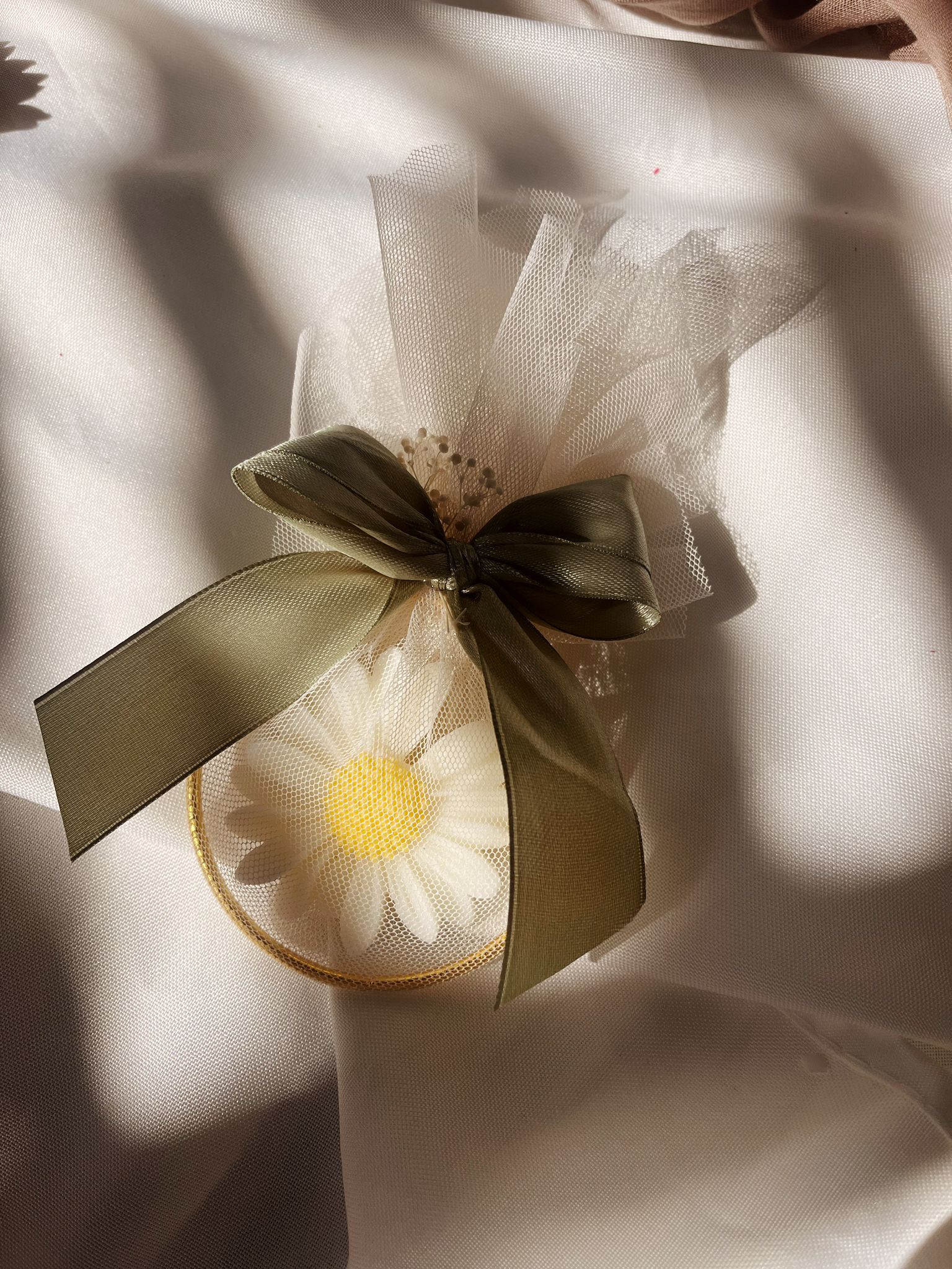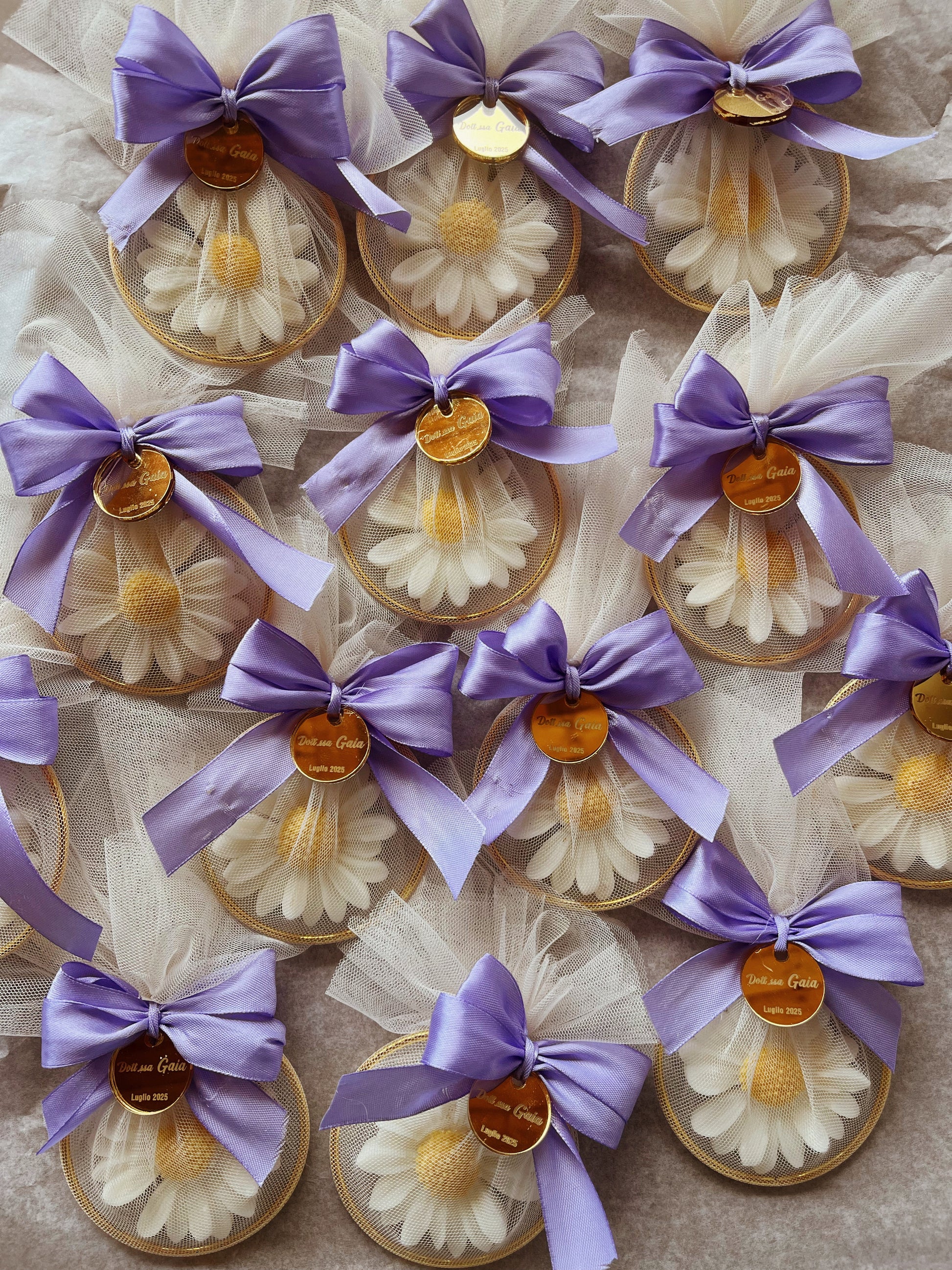 Un dettaglio raffinato per ogni occasione: la nostra candela profumata artigianale, confezionata in un elegante cerchio oro, è impreziosita da un fiocco decorativo, e una etichetta incisa personalizzata con nome e data.