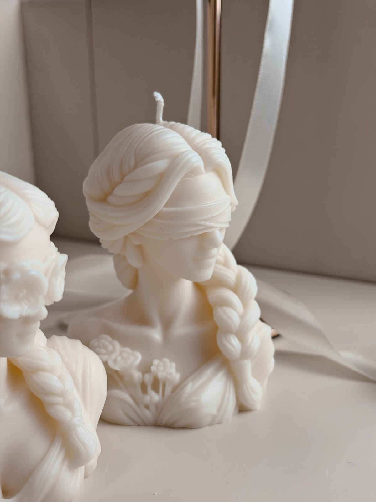 Un’elegante candela scultorea che unisce arte e simbolismo. La delicata figura femminile bendata, finemente modellata in tonalità avorio, dona un tocco raffinato e senza tempo a qualsiasi ambiente. Perfetta come decorazione di stile o bomboniera.