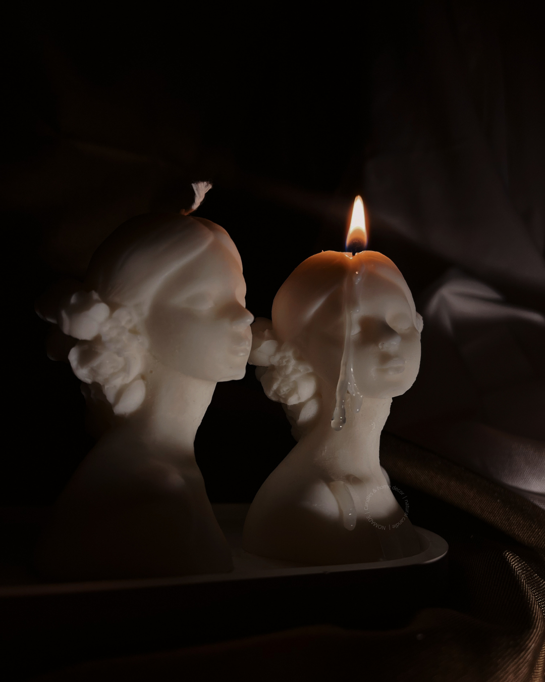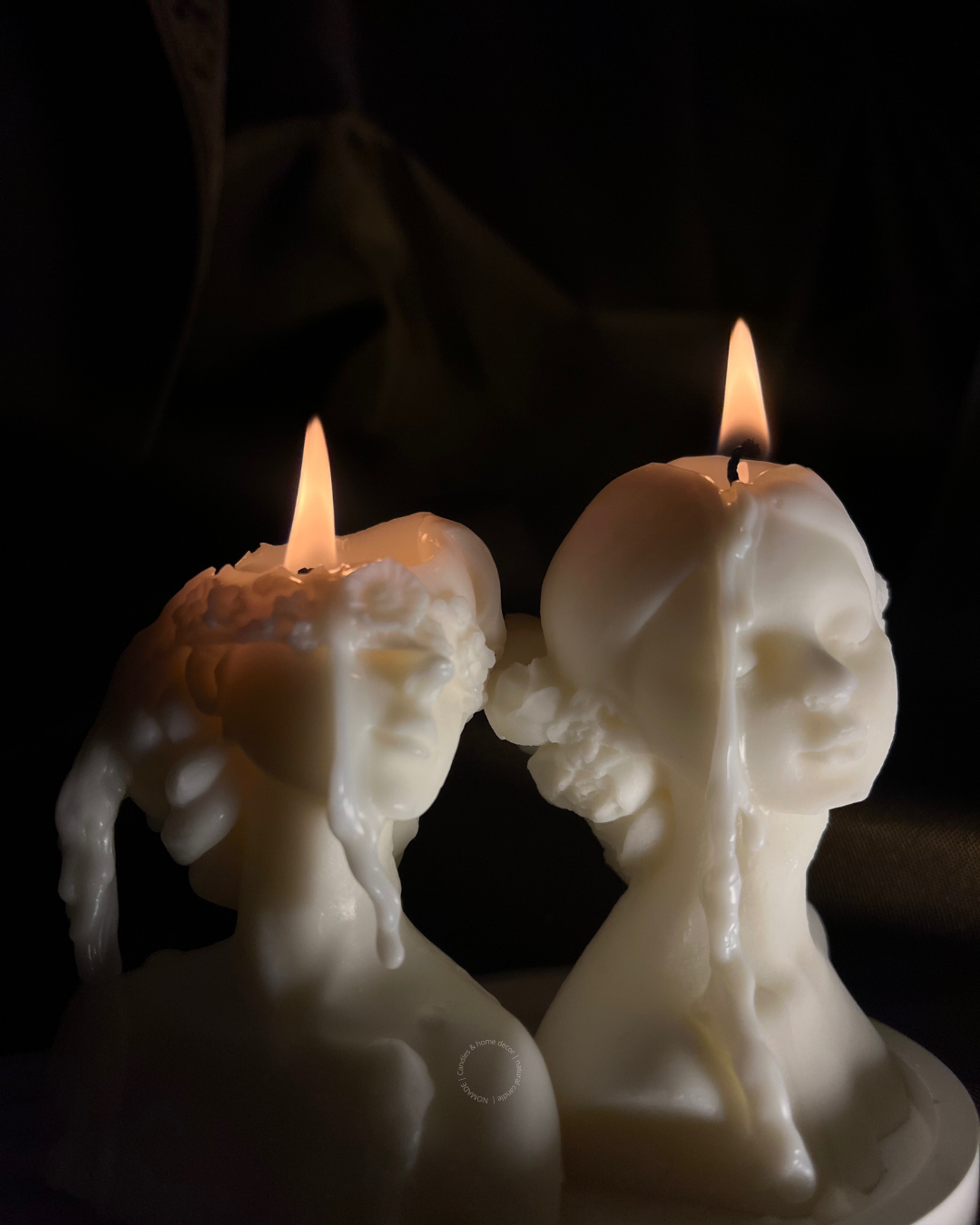 Un volto che racconta grazia, una cascata di fiori che simboleggia la bellezza e la rinascita. Questa candela è un tributo alla potenza e all'eleganza della femminilità, capace di illuminare ogni angolo con intensità e poesia.