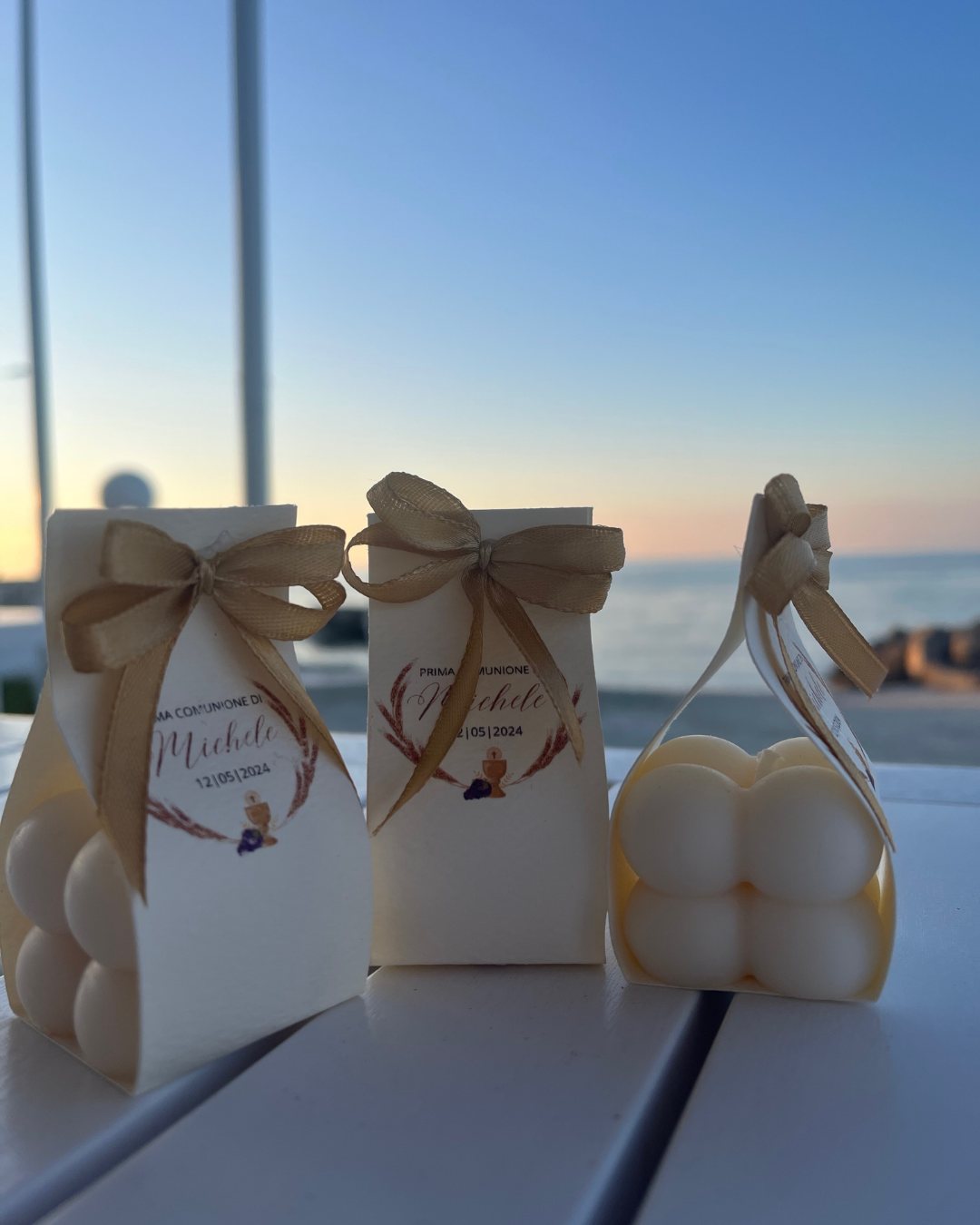 Un dettaglio unico e raffinato: la nostra candela a forma di bolle, accompagnata da un cartoncino personalizzato, è il connubio perfetto tra design e personalità. Ideale per celebrare momenti speciali, con uno stile che parla di te.