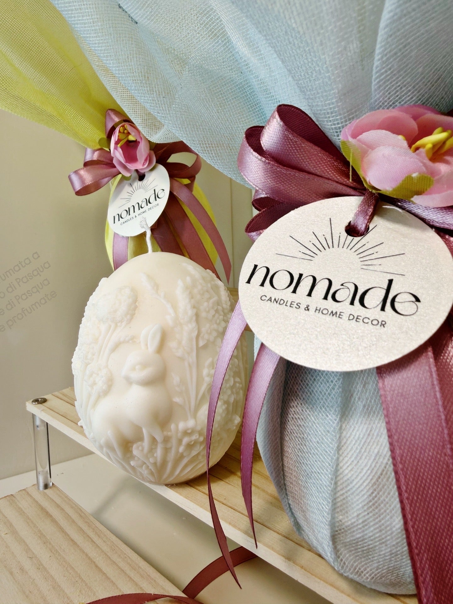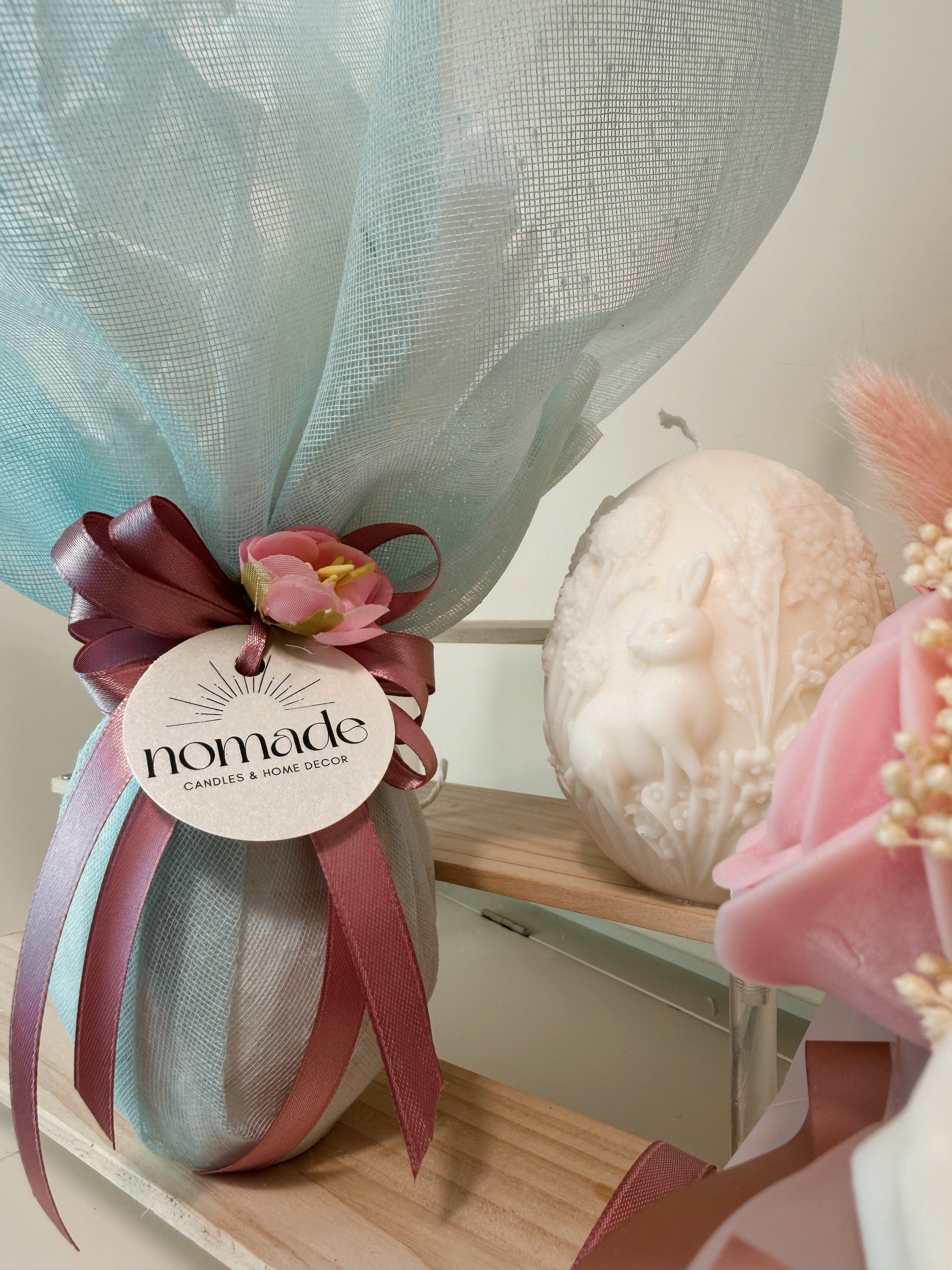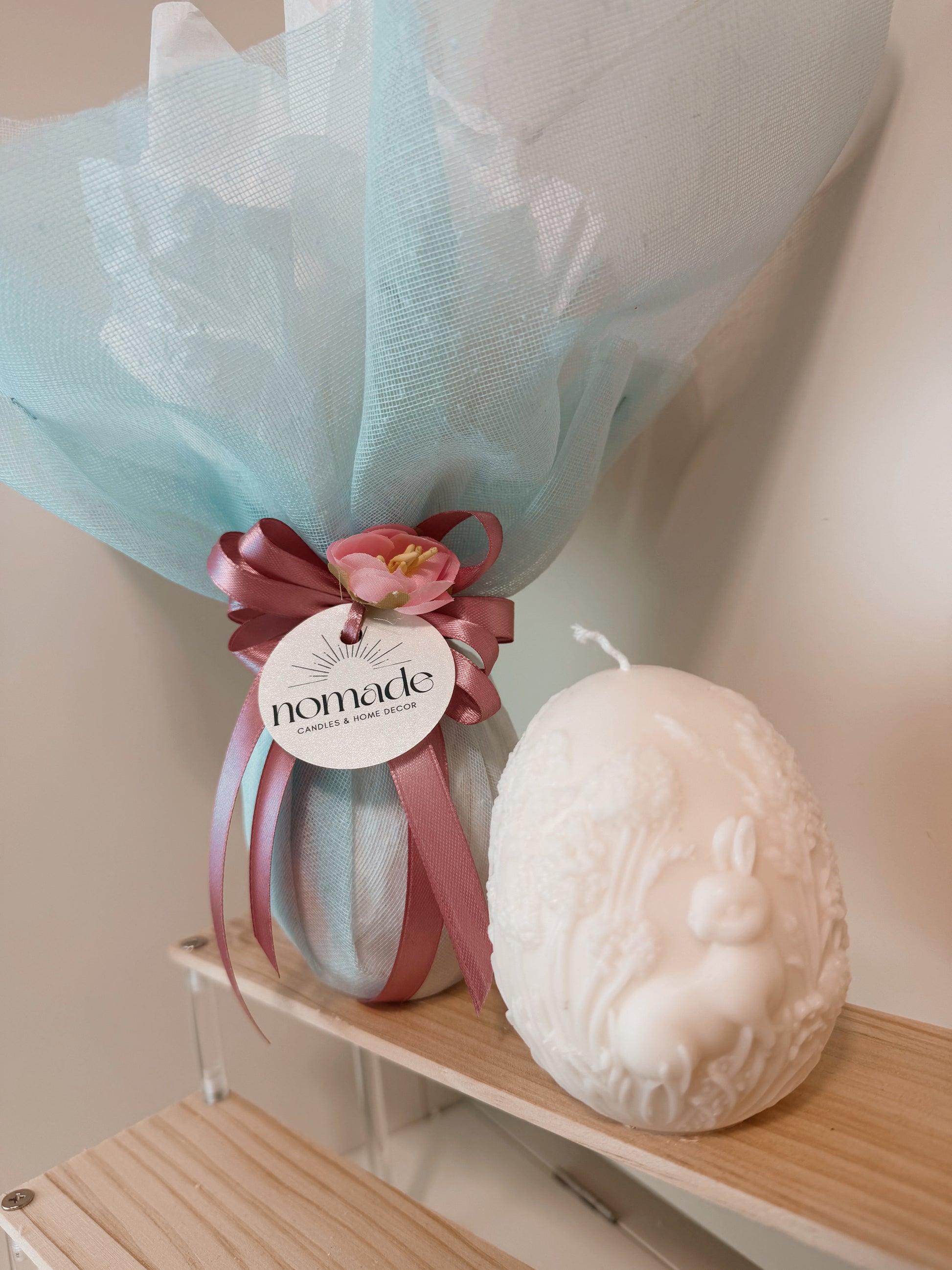 Dentro l’uovo troverai una candela a forma di uovo, realizzata a mano e perfetta per portare un’atmosfera calda e primaverile in casa.